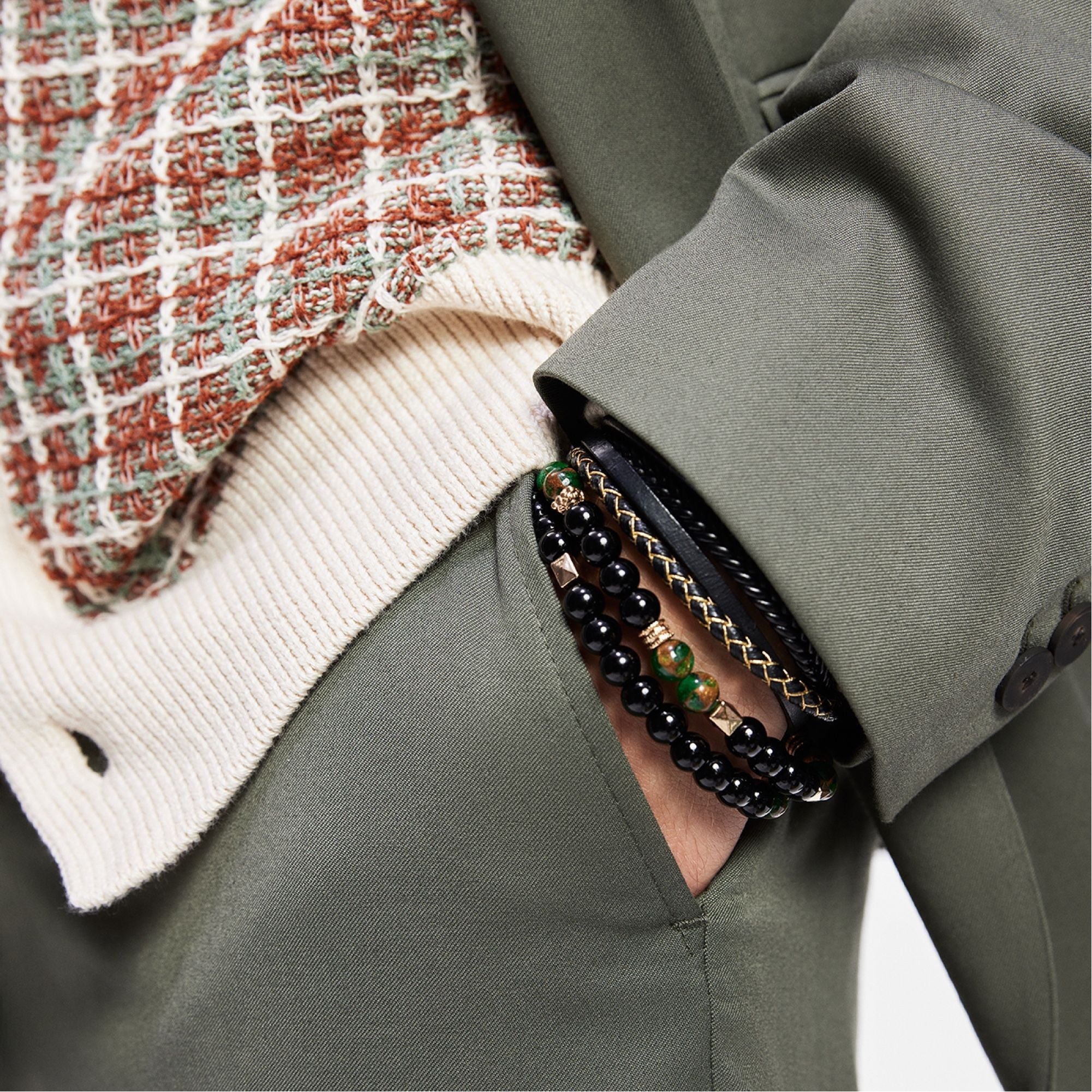 Skull-detailed emerald-onyx beads pair with faux-leather wraps to form a stack that slides on with cords, ready to elevate brunch wanderings and rooftop nights. Layer it against a rolled-sleeve denim jacket for brunch wandering, or stack it beside a sleek slip dress for rooftop after-dark plans.