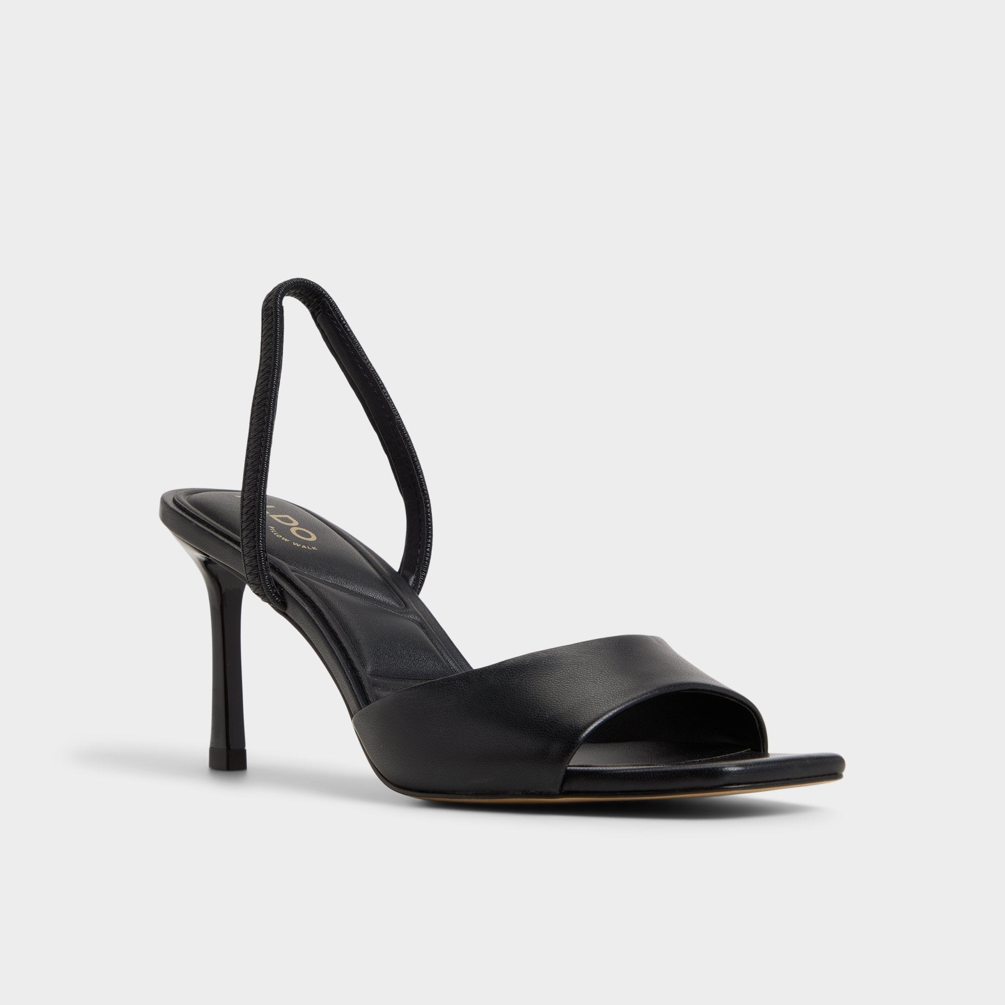 Supple black leather drapes the foot with an elastic slingback and sculpted stiletto heel, offering smooth confidence and cushioned comfort for rooftop goodbyes. Pair with tailored trousers for client brunches, or swap under a slip dress when city lights call for late tapas as the evening unfolds.