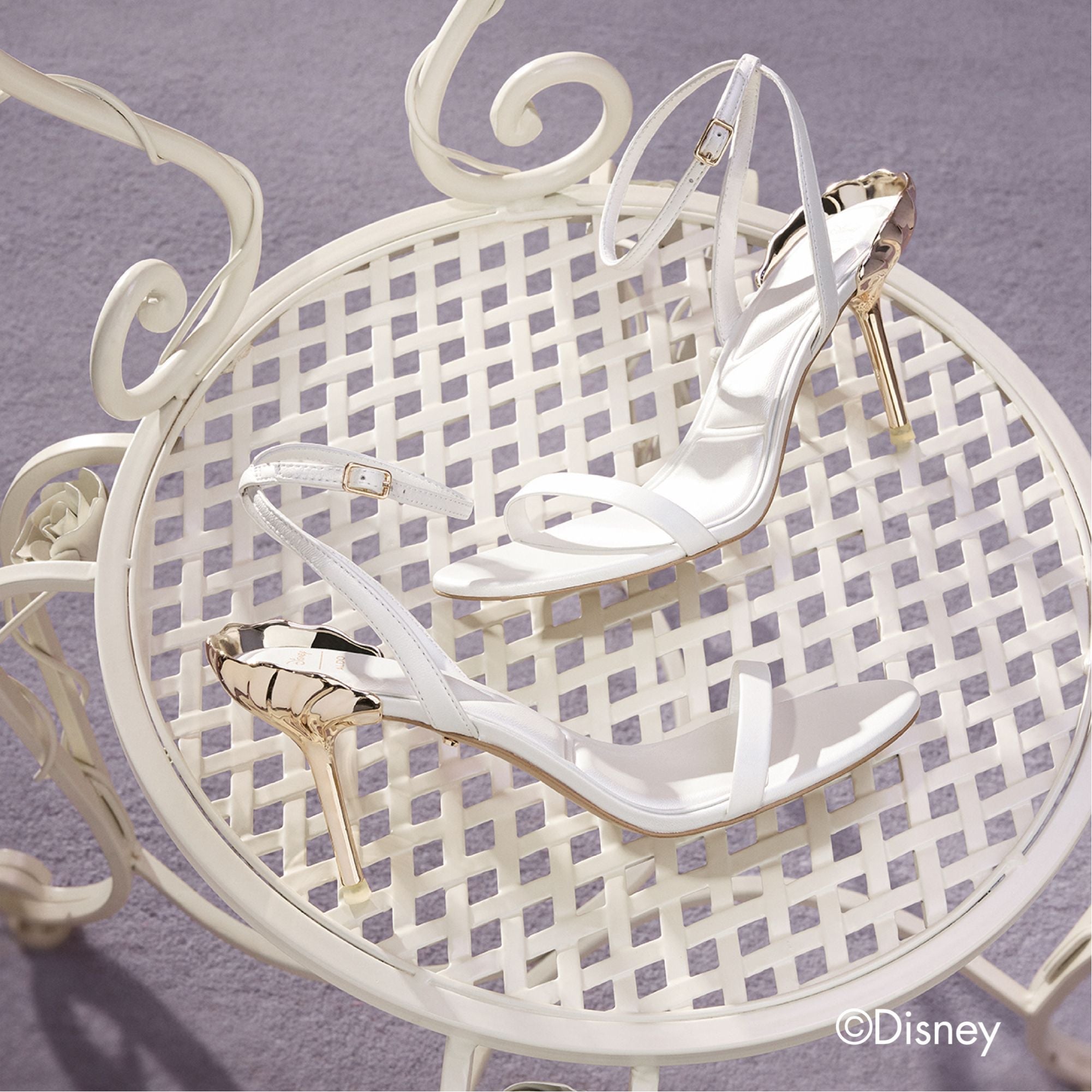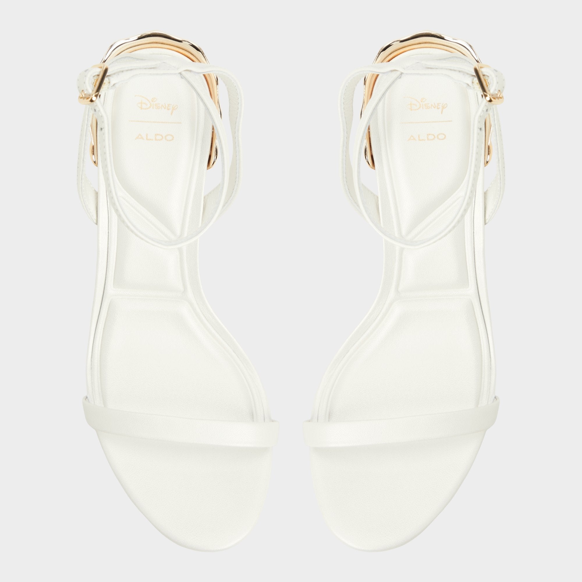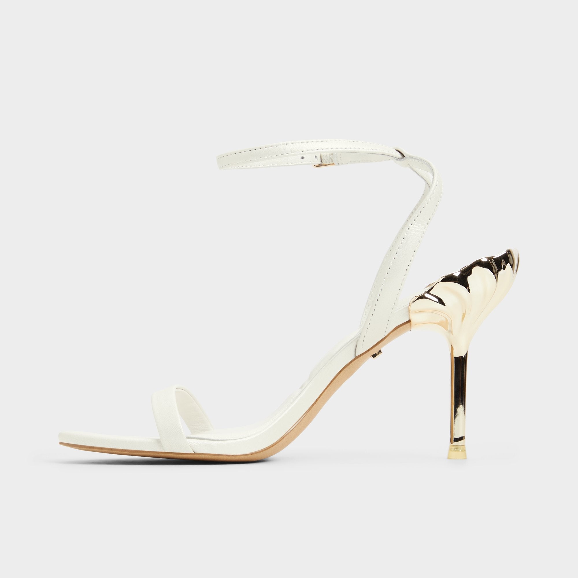 One step closer to Ariel's dreams, these ocean-inspired stiletto sandals were made to make waves. The gold shell design on the heel pairs elegantly with the dainty white leather ankle strap, a style to be treasured.