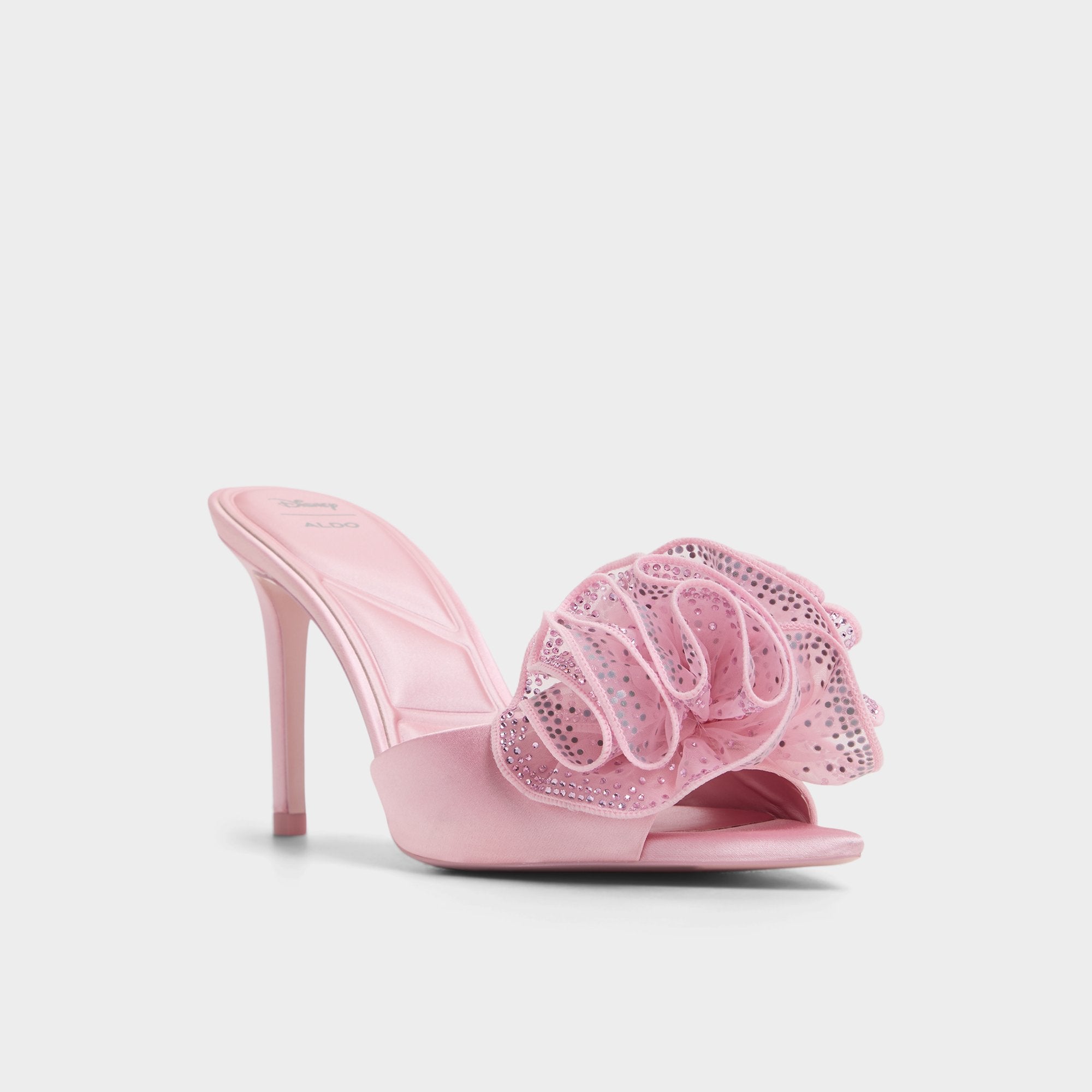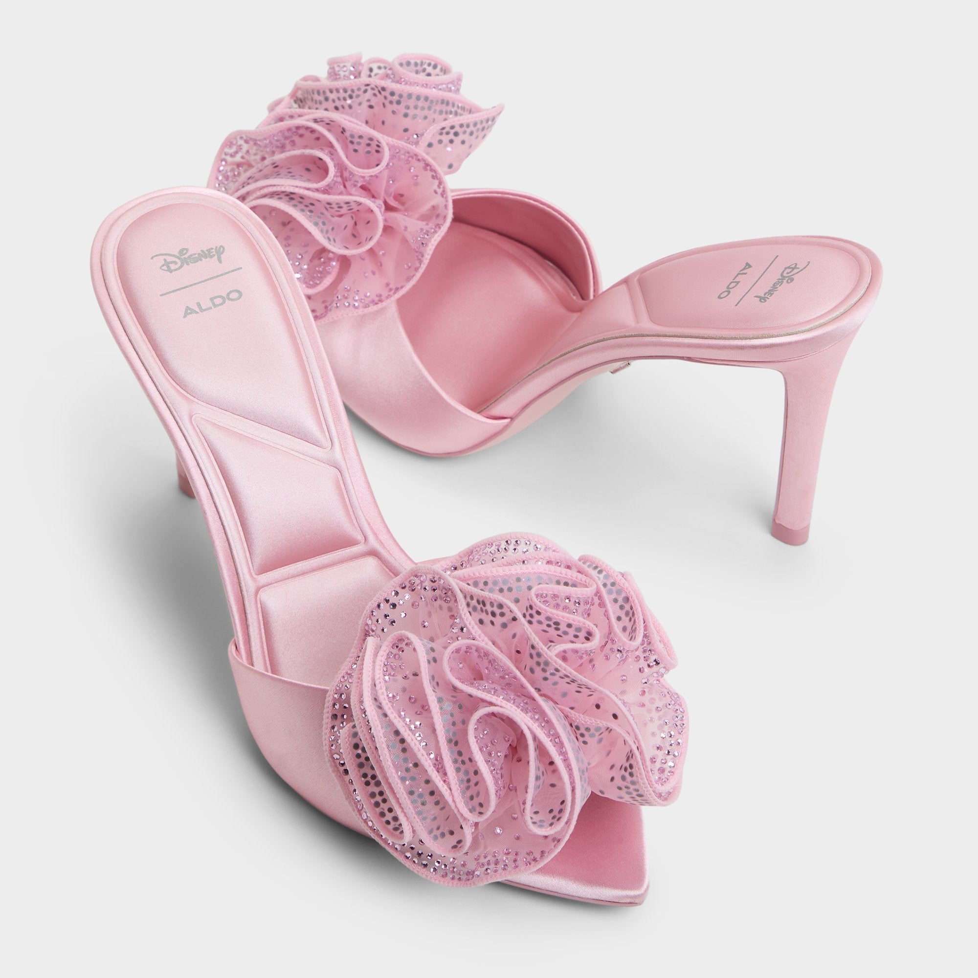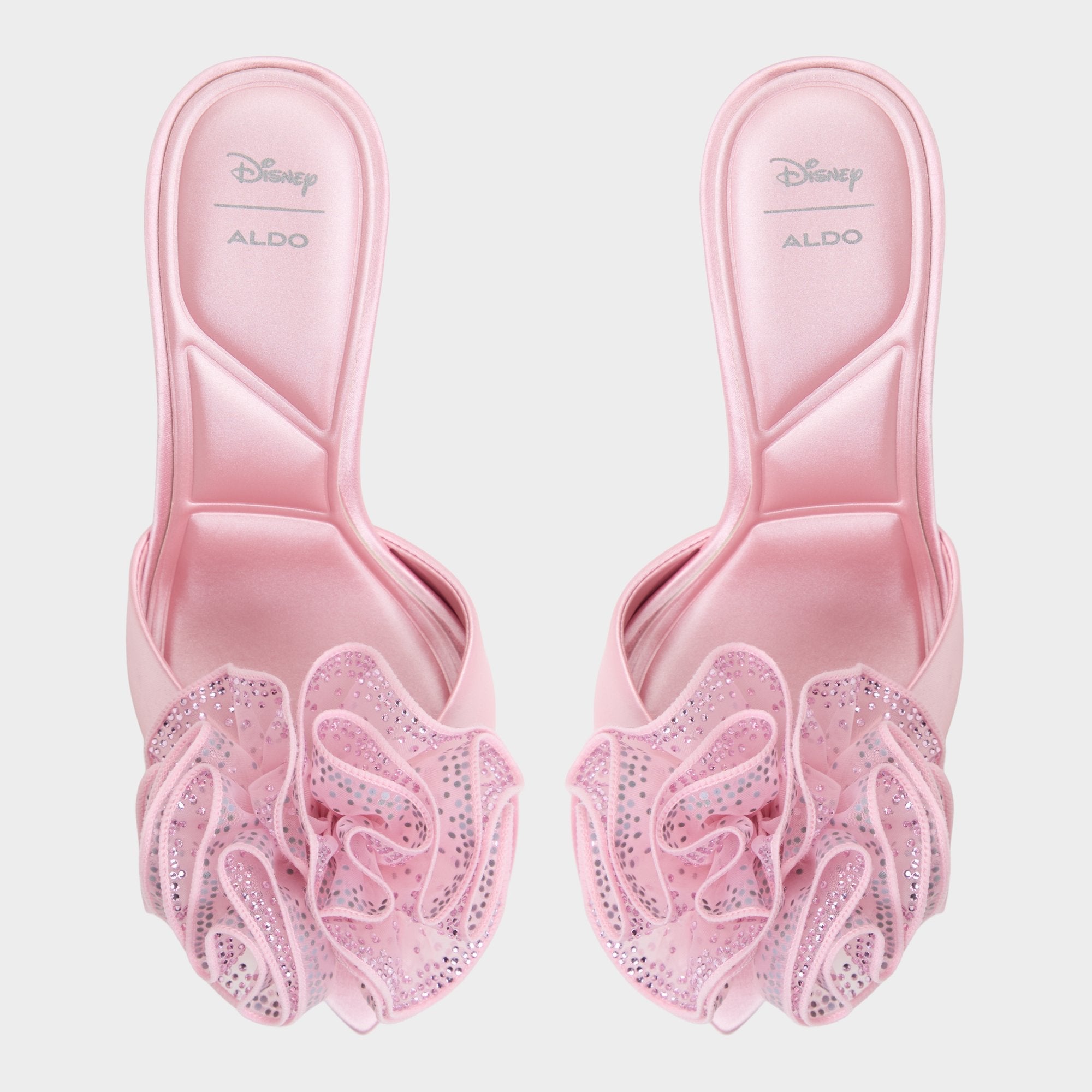 Don't sleep on these beauties. Pretty in Aurora's signature pink, these satin heeled mules are adorned with a soft, romantic rose and subtle rhinestones, perfect to finish any fairytale look.