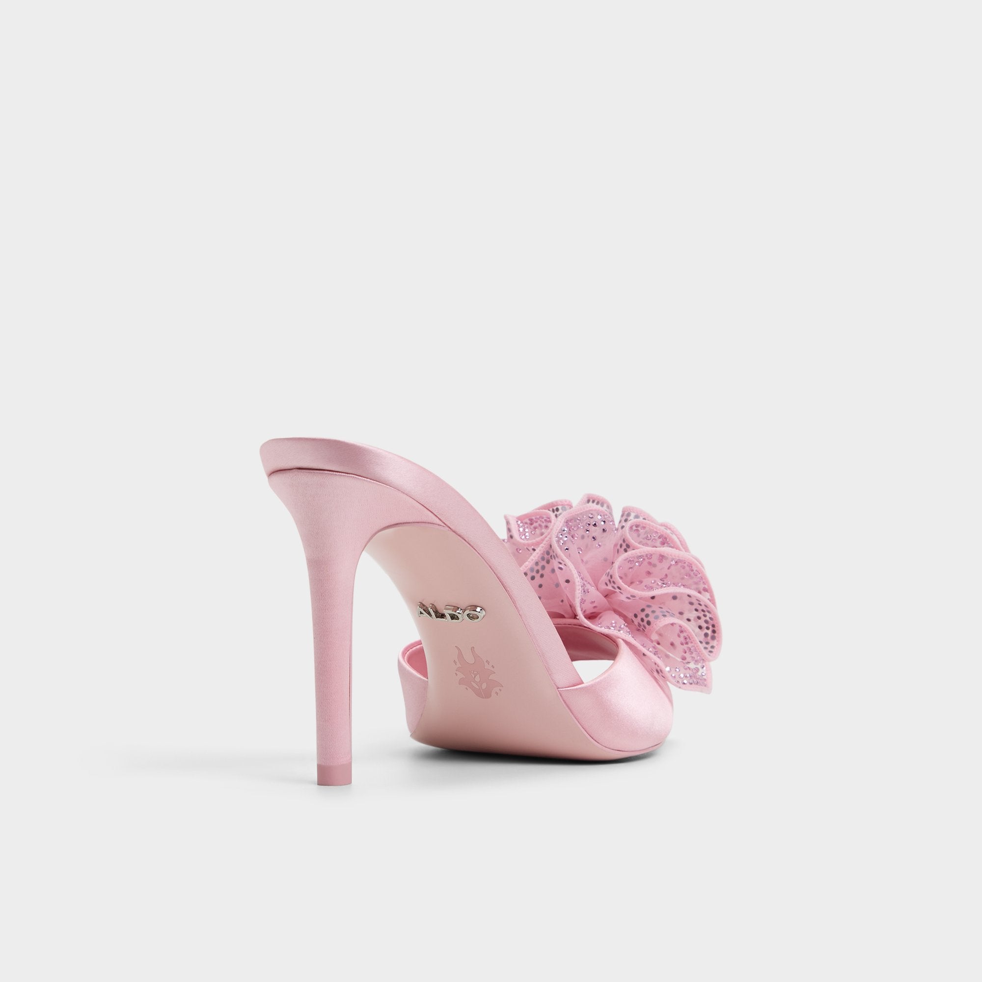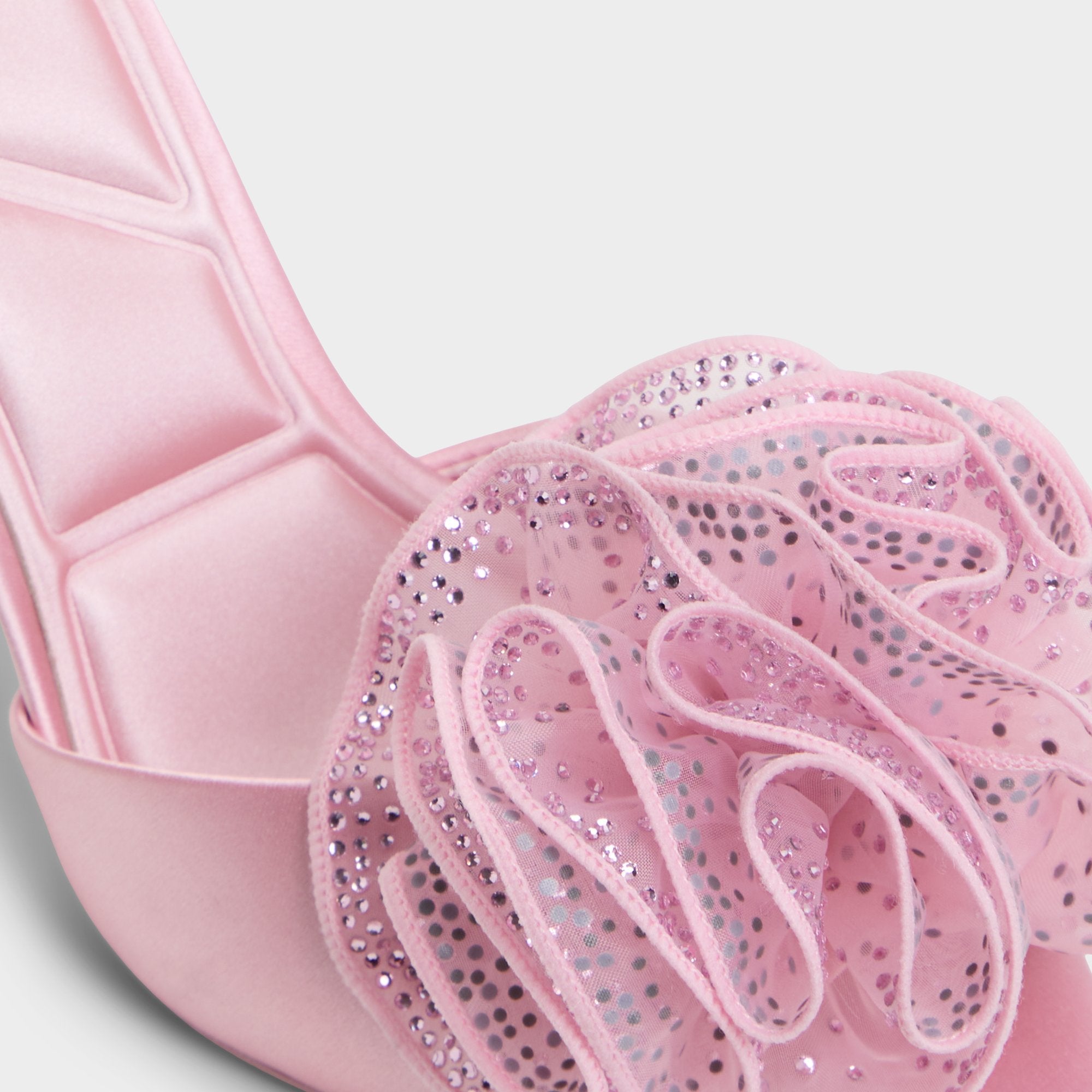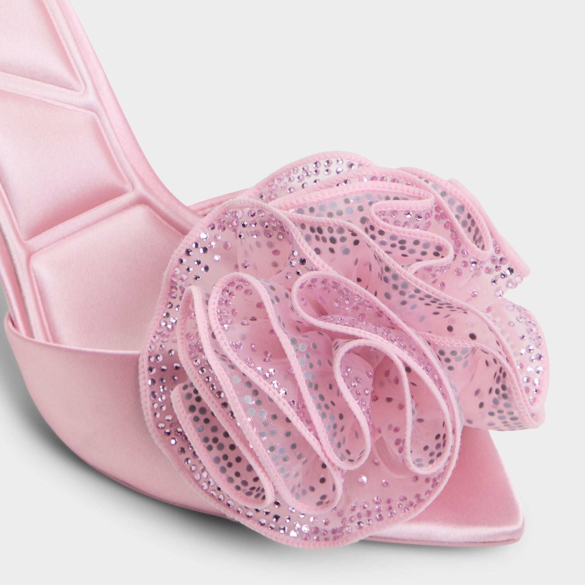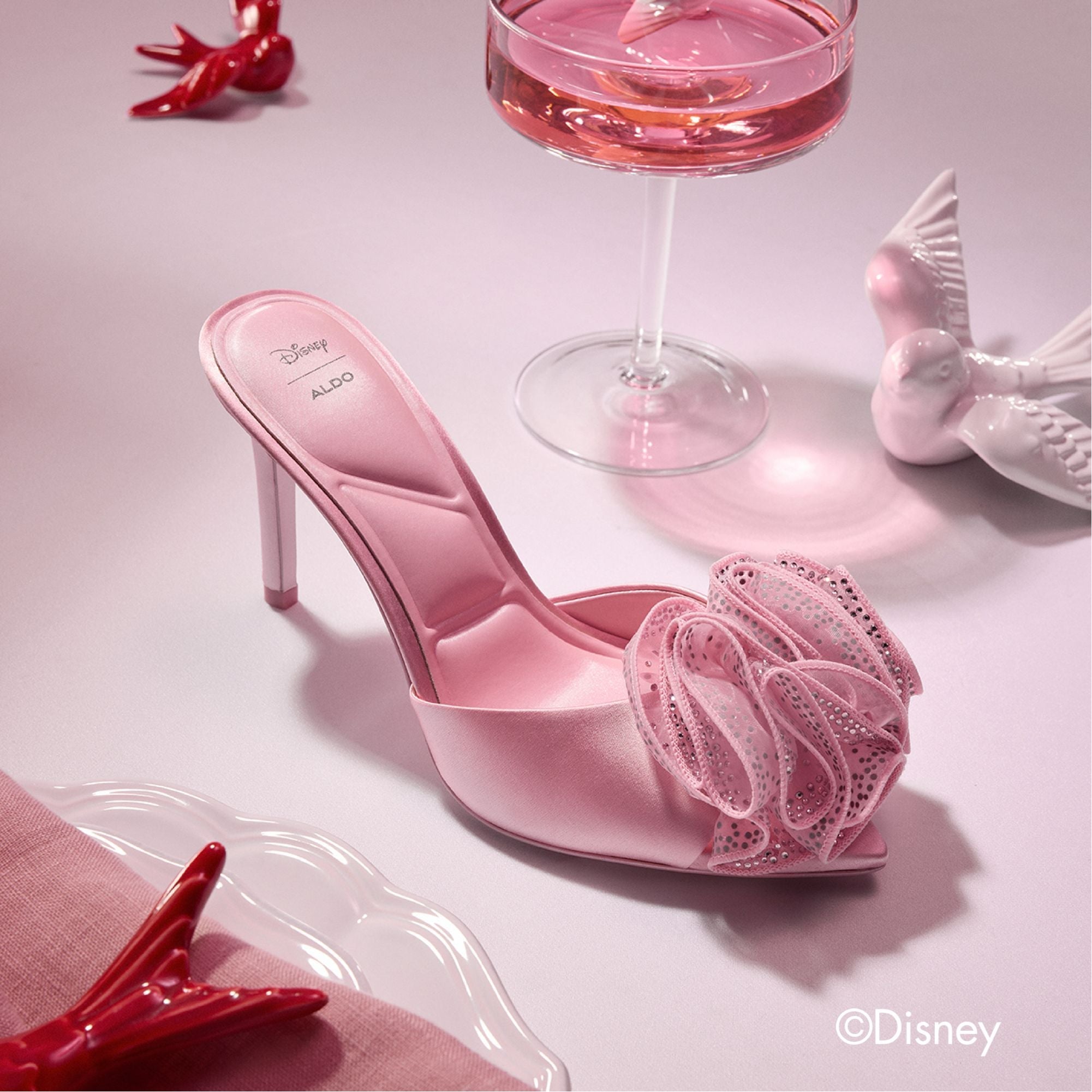 Don't sleep on these beauties. Pretty in Aurora's signature pink, these satin heeled mules are adorned with a soft, romantic rose and subtle rhinestones, perfect to finish any fairytale look.