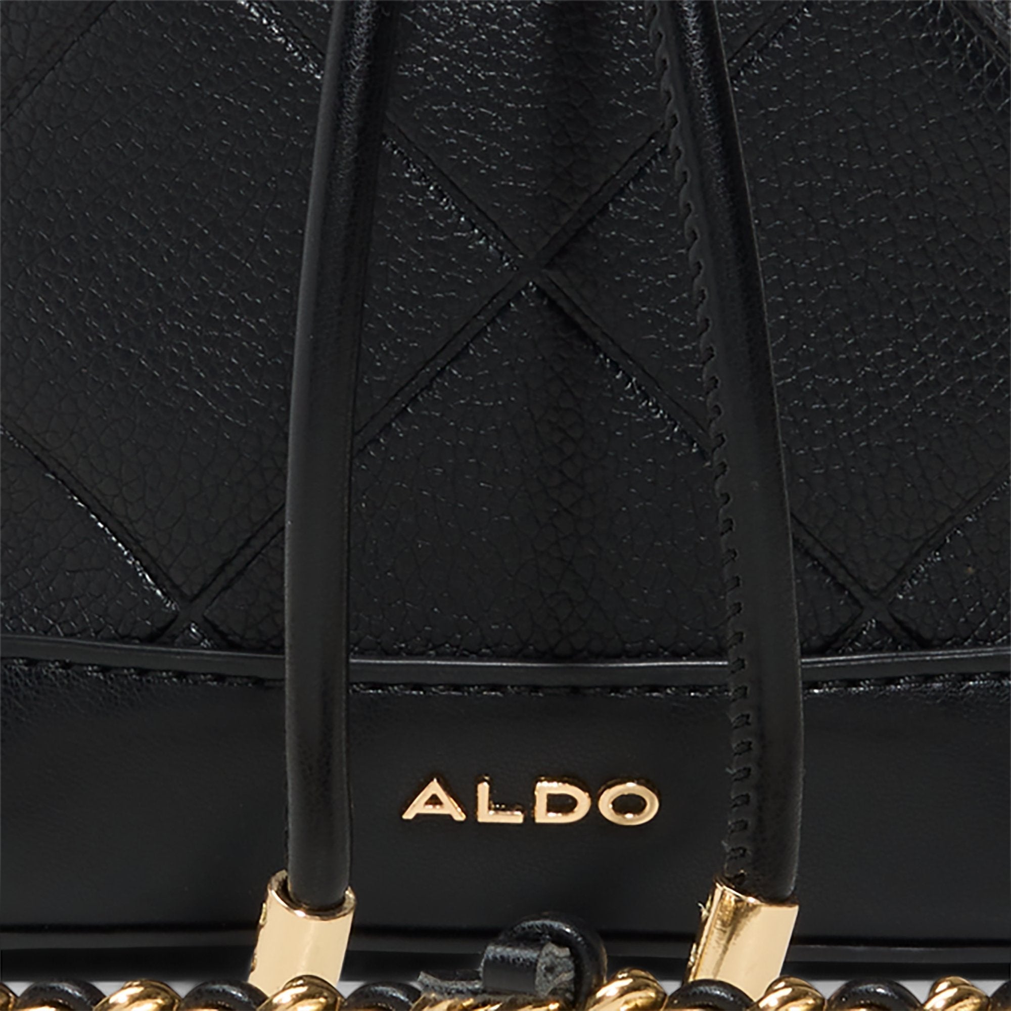 Diamond quilting on supple black leather gives this mini bucket luxe appeal, cinched by gold grommets and a gleaming chain strap that instantly polishes its drawstring silhouette. Carry it with sharp blazers for coffee catch-ups, or tuck it under a satin slip for rooftop nights.