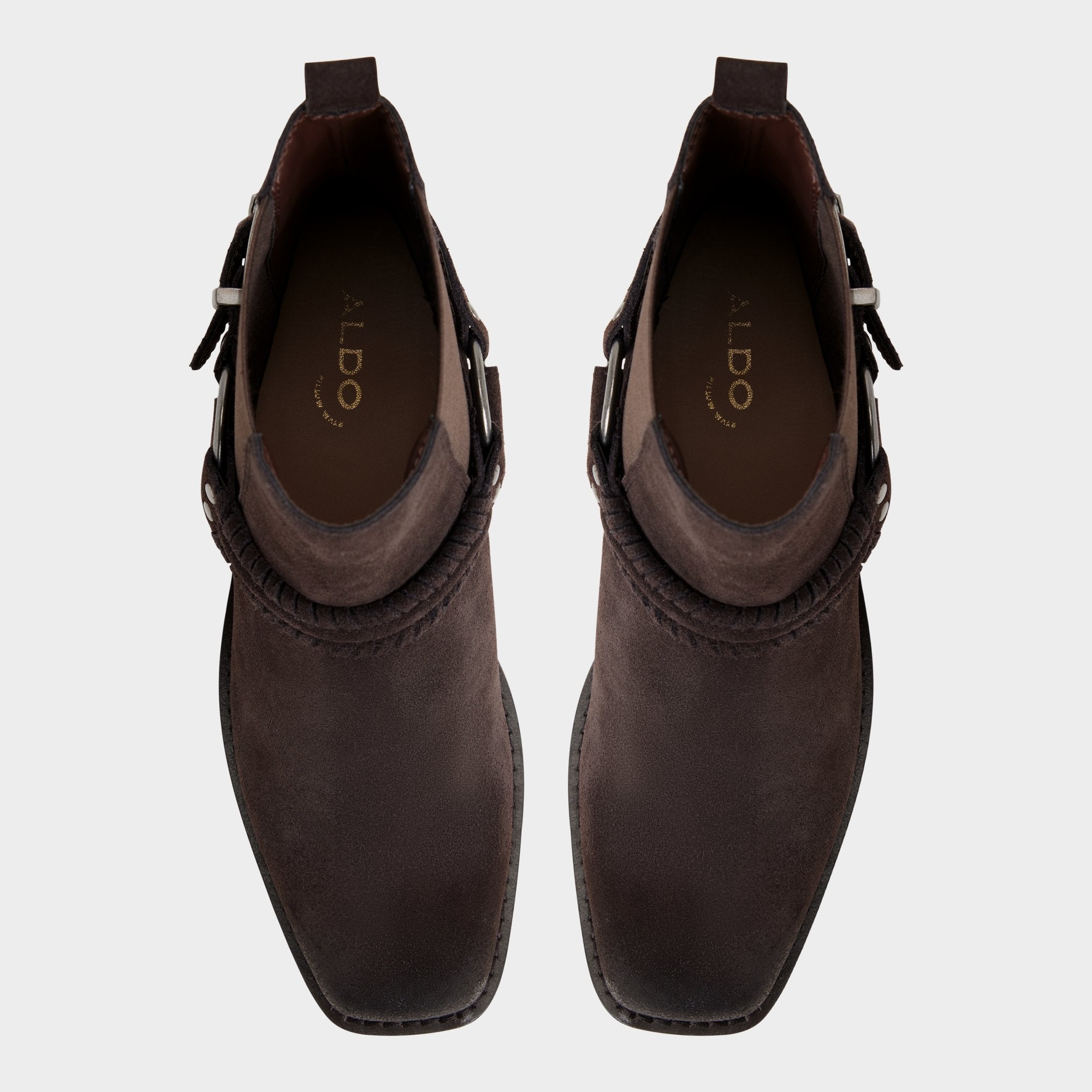 Velvety suede meets a low-slung block heel, but the western-inspired harness strap with burnished buckle, ring, and studs adds just enough attitude, turning everyday strides into confident showdowns down city blocks. Pair with relaxed denim for coffee runs or ground a floral mini when festival nights demand comfort that still keeps the spotlight.