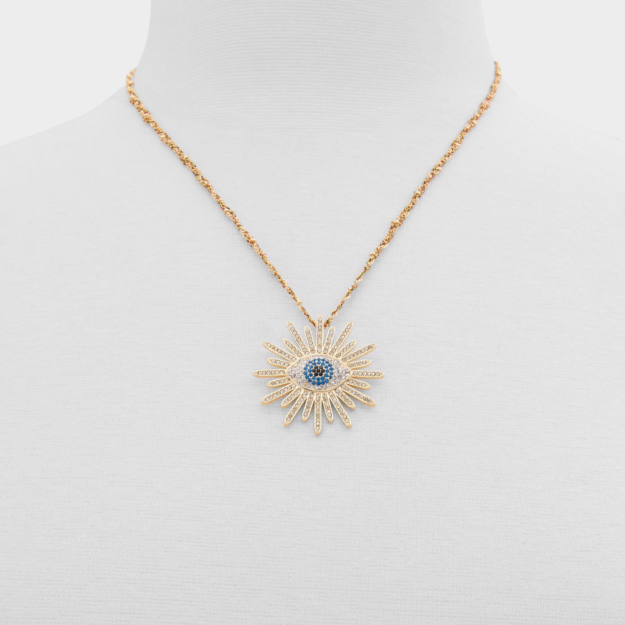 Radiant daisy petals shimmer in pave around a vivid sky-blue center, suspended from a textured gold chain that can shorten or drop to turn a simple necklace into instant sunshine. Layer it over a ribbed tank and jeans for coffee runs or frame a slipdress at rooftop parties to catch every sunset sparkle.