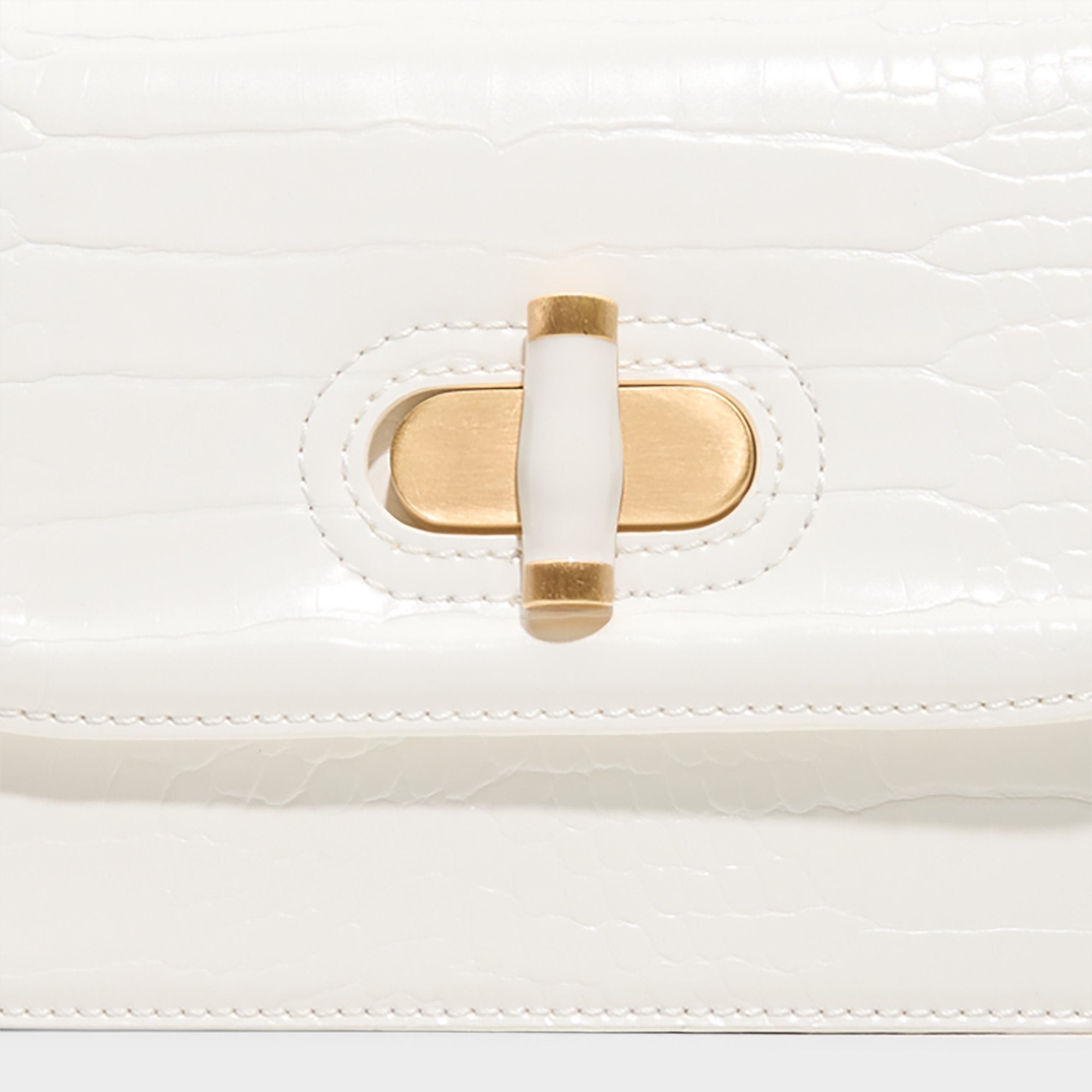 Crisp croc-embossed leather catches the eye as a chunky bamboo top handle steals the scene, finished with a turn-lock that hints at quiet luxury and everyday city polish. Carry it with tailored linen for office catch-ups, or tuck it under your arm with a sundress and sandals at cafe dates.