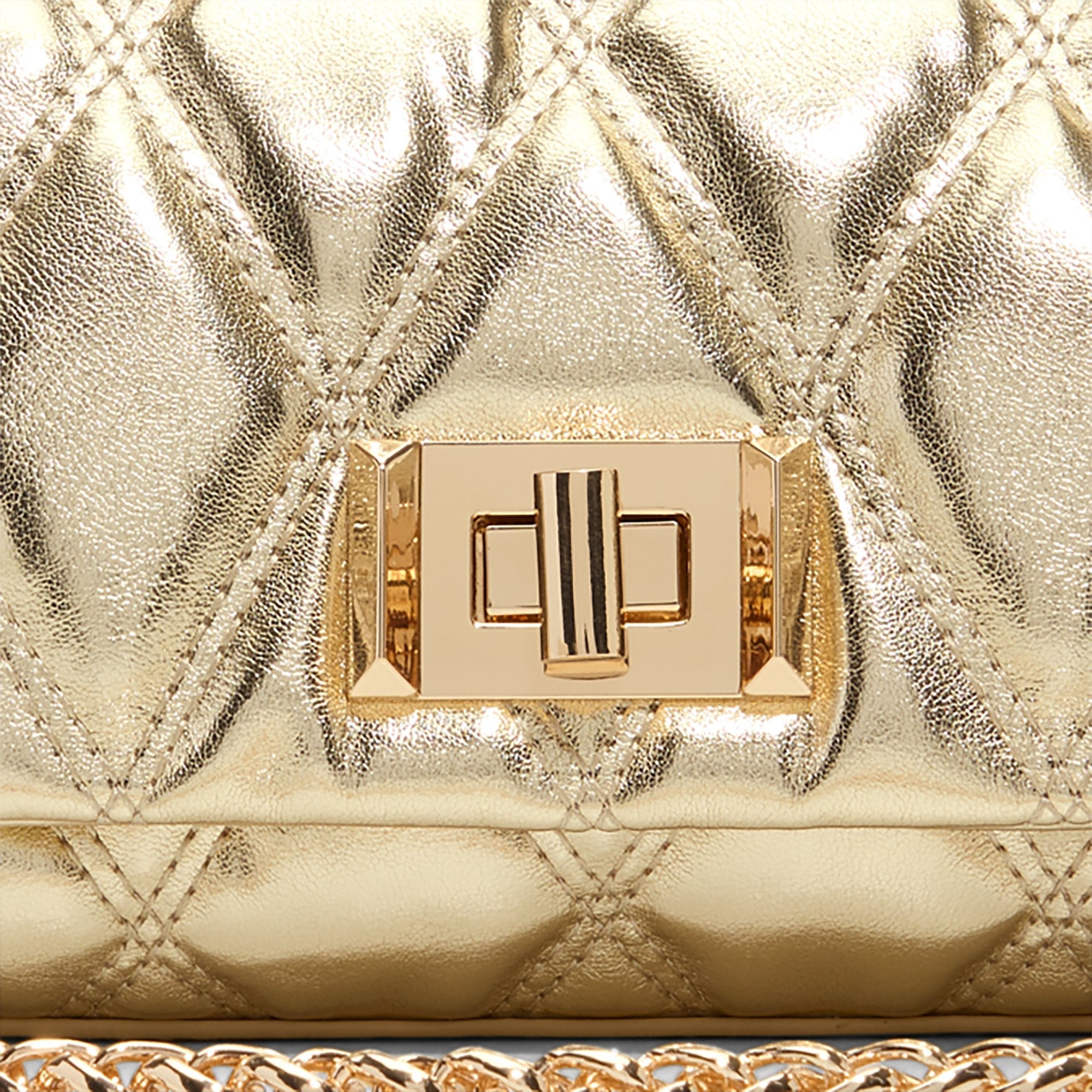 The Lediaa crossbody bag shines boldly with its metallic gold finish and quilted texture. Designed for those who dare to stand out, this eye-catching accessory effortlessly blends luxury with edgy style. Its compact size and versatile strap make it perfect for making a statement on the go.