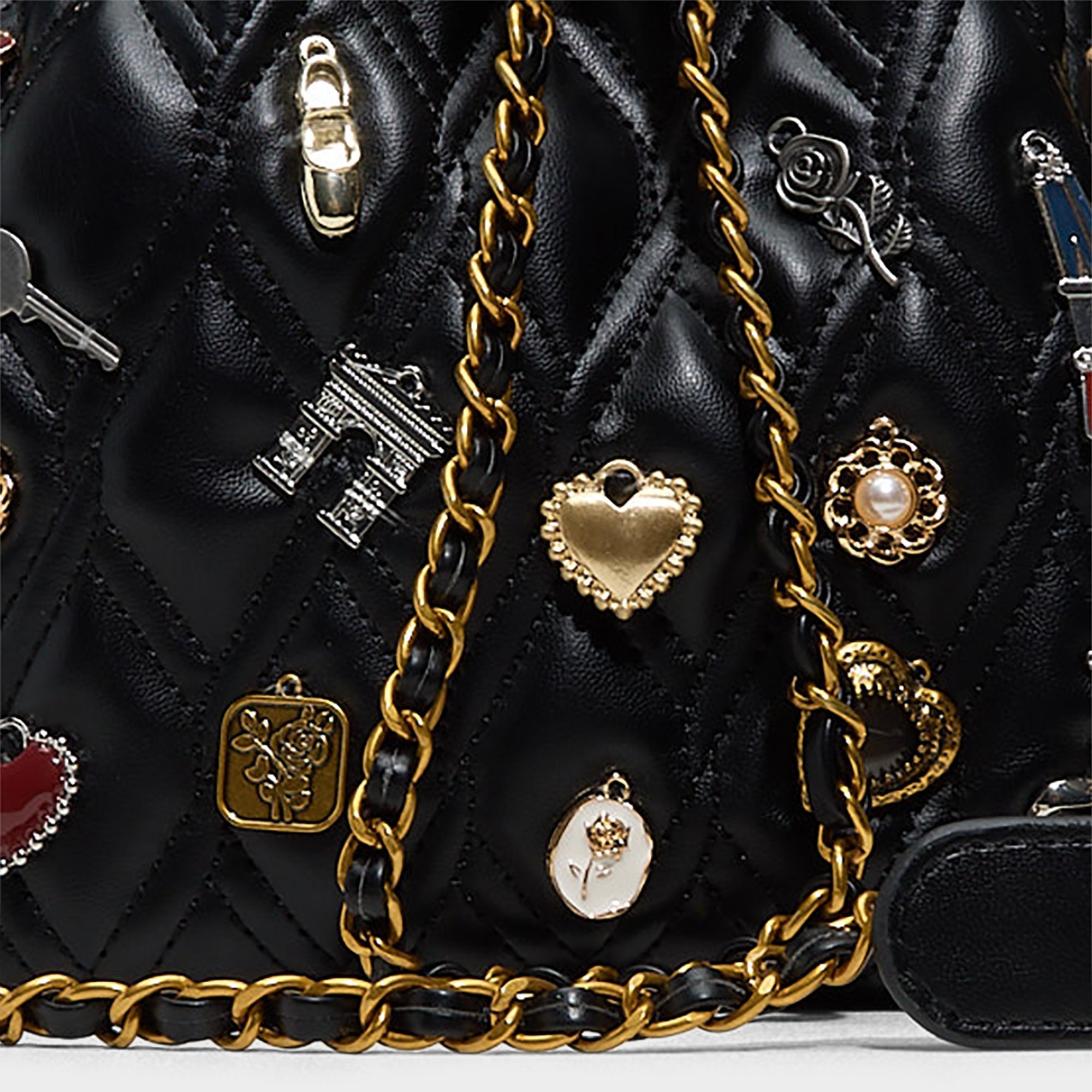 This bucket bag brings playful Parisian charm to your everyday look. Featuring a quilted design and drawstring closure, it keeps your essentials secure with a vintage twist. Adorned with Paris-inspired pins, this crossbody bag offers a fun, flirty vibe perfect for adding a touch of whimsy to any outfit.