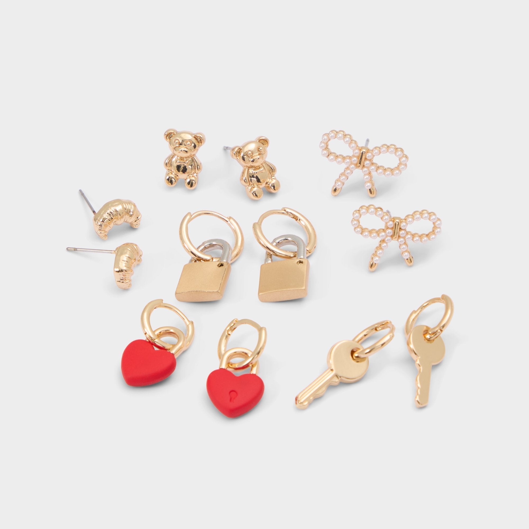 Teddy-bear charms, crystal bow, enamel heart and key-lock duo form a playful cast of charms you can swap across studs and mini hoops, turning the set into a moodboard. Stack them with chunky cuffs for concert nights or let one dainty heart solo beside a linen blazer at coffee interviews, sealing the vibe.