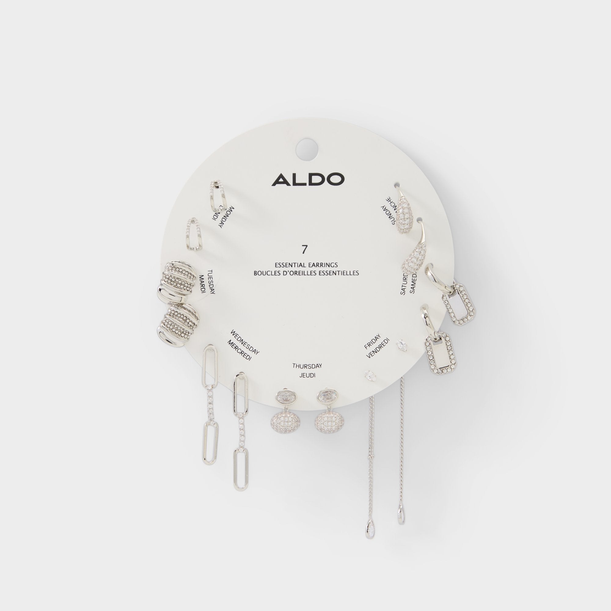 Seven shimmering silhouettes-from pave huggies to shoulder-skimming chain drops-circle this earring set, giving you pre-planned sparkle in one sleek card. Layer Monday studs with a crisp blazer for presentations or swing Saturday drops beside tousled waves and a slip dress for rooftop parties.