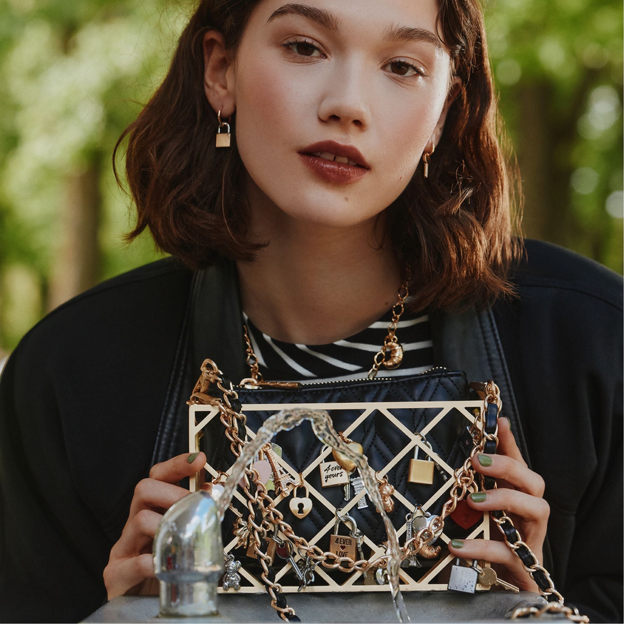 Charm-studded lattice crowns quilted leather, while a gold cage of tiny locks and keys glints along a chunky chain strap, turning this shoulder bag into wearable jewelry. Carry it with a slip dress for rooftop dates, or sling it over sharp tailoring at gallery openings to finish every outfit with a touch of fearless sparkle.