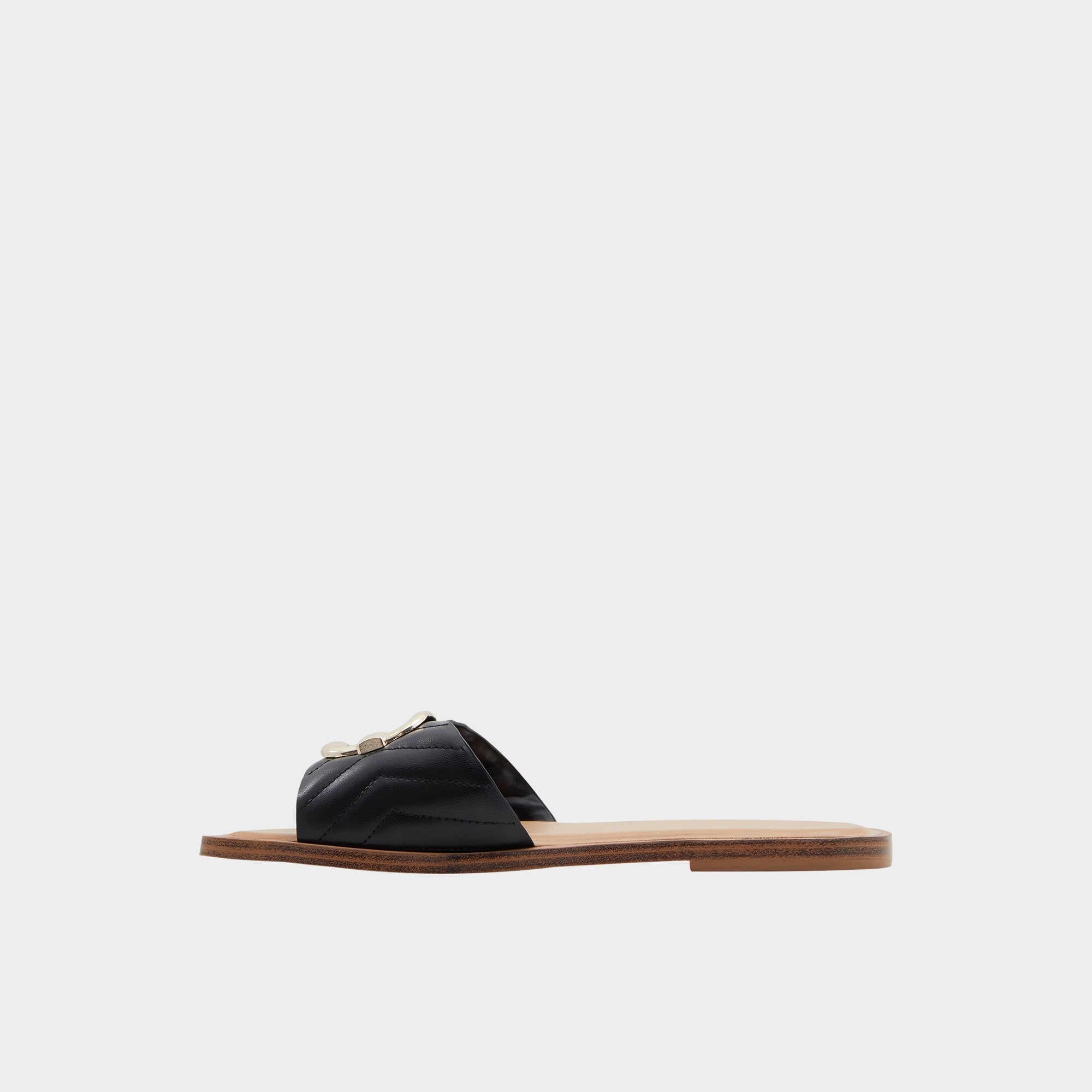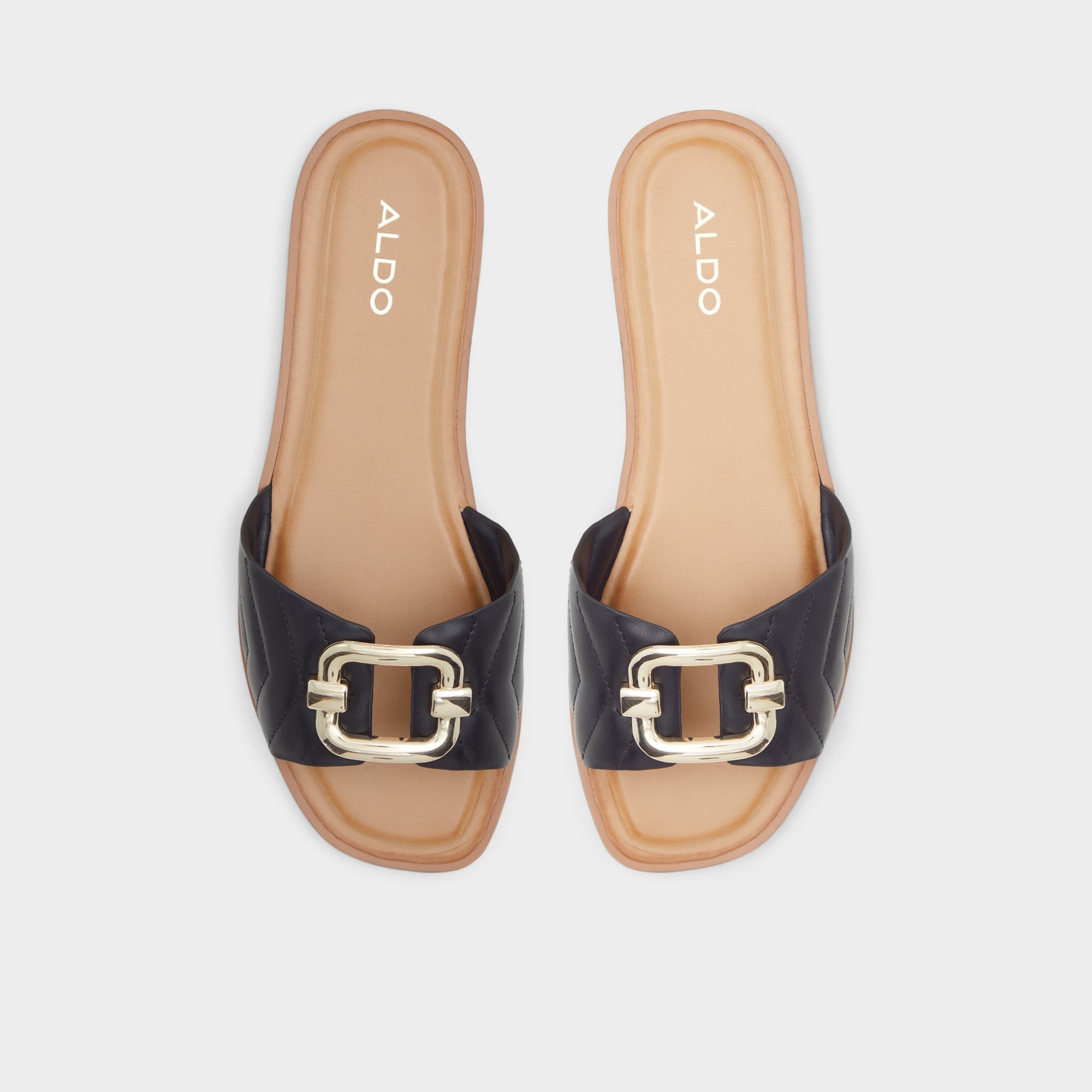 Distinguished by quilted finish and a sleek metal ornament, these easy on, easy off slide sandals are perfect for everyday living.