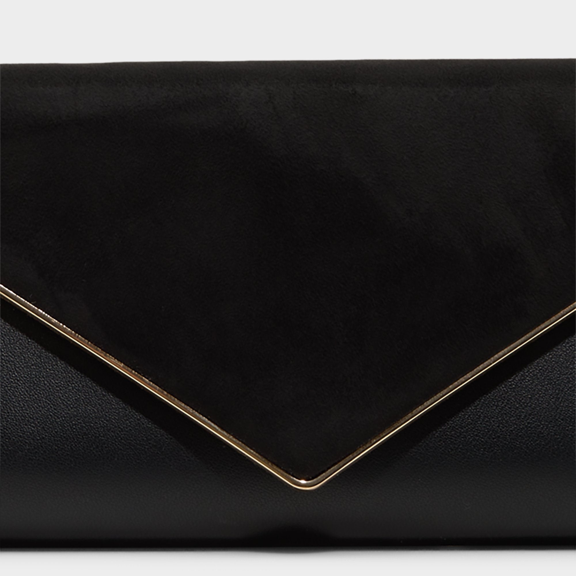Velvety suede folds into a sharp envelope over smooth black leather, edged in gold with a sculptural snake-link strap that snaps off, flipping the clutch from hand hero to effortless shoulder swing. Carry it with a satin slip at rooftop drinks or sling it over a blazer-and-jeans brunch look, pulling every outfit together with subtle rebel polish.