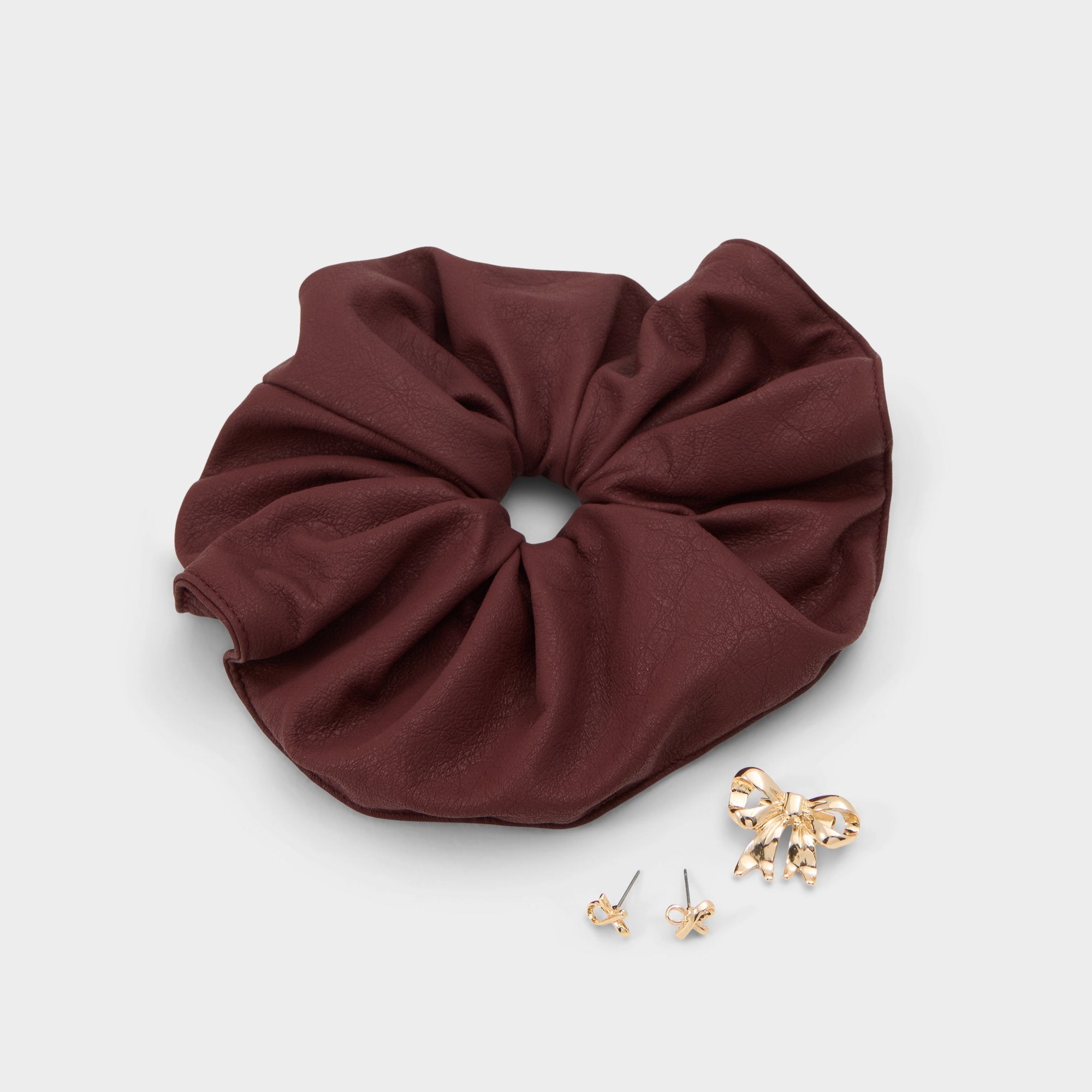 A plush decorative bag charm bear peeks from a burgundy faux-leather scrunchie, its gold-tone bow and crystal gift charms adding playful holiday sparkle to this soft wrap. Twist it around a sleek ponytail for office parties or stack it on your wrist during cocoa runs, sealing outfits with cozy whimsy.