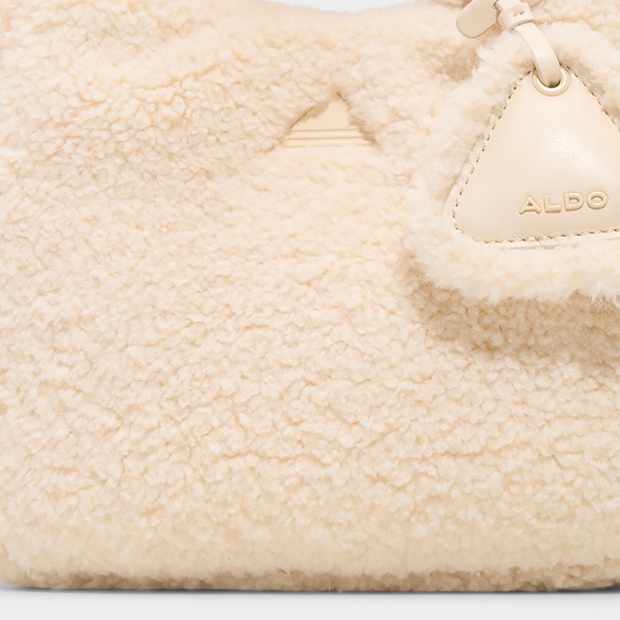 Cloud-soft sherpa envelopes this mini tote, with padded beige handles and a micro-pouch that keeps essentials close at hand, turning every city errand into a warm, hands-free moment you’ll want to repeat. Carry it with a chunky knit and cuffed jeans for coffee runs, or sling it with a wool coat for cozy movie nights.