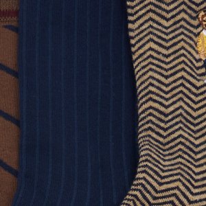 Teddy bear embroidery stands out on chevron socks, paired with ribbed navy and brown stripe pairs for playful charm when legs cross. Flash above loafers on campus runs, or layer them under boots at cafes for two distinct looks that finish outfits with a touch of whimsy.