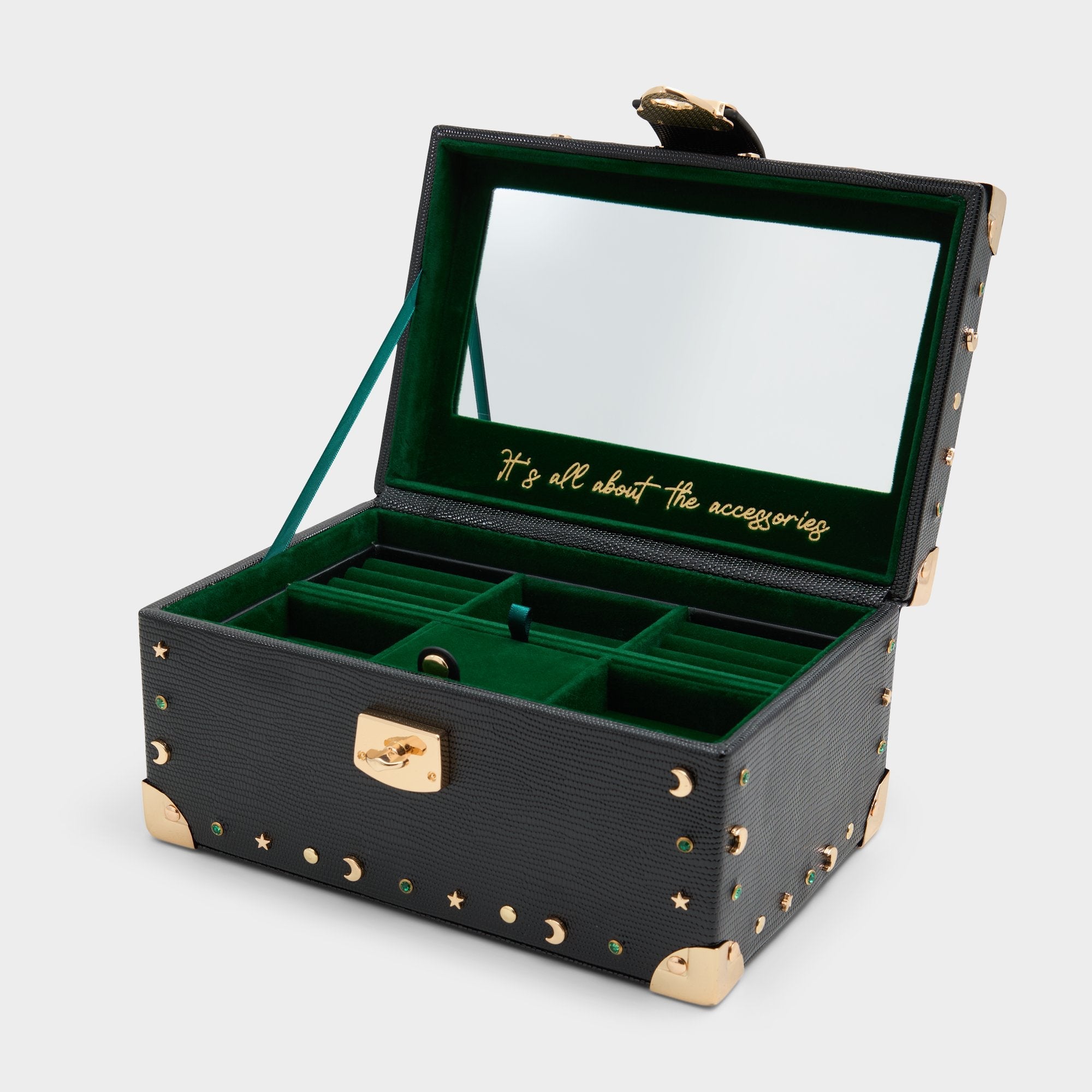 The perfect piece for storing all of your bewitching charms. Discover this limited-edition jewelry box inspired by Elphaba. Featuring black exterior with gold and emerald detailing, this piece is finished inside with a full-size mirror and green velvet cushioning.