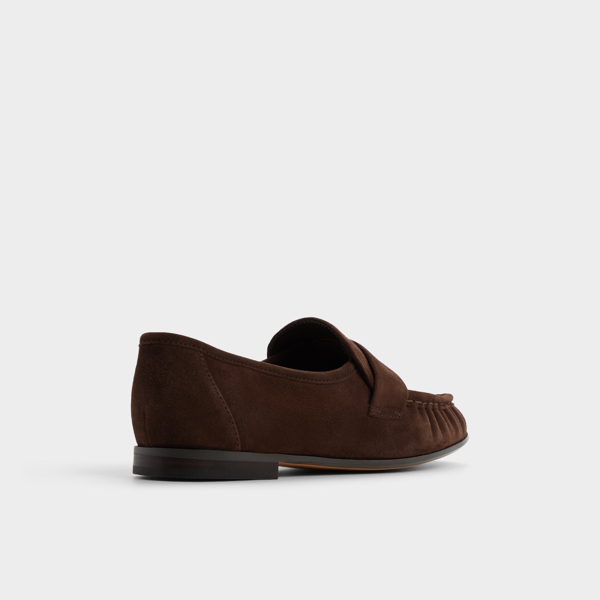 Buttery espresso suede shapes these penny loafers with ruched moc toes and a flexible cupsole, blending tailored refinement with sneaker-like ease and cushioned comfort for long days at every commute and meeting. Ground cropped trousers for presentation mornings, or swap into cuffed jeans when Friday train rides lead straight to patio tapas.